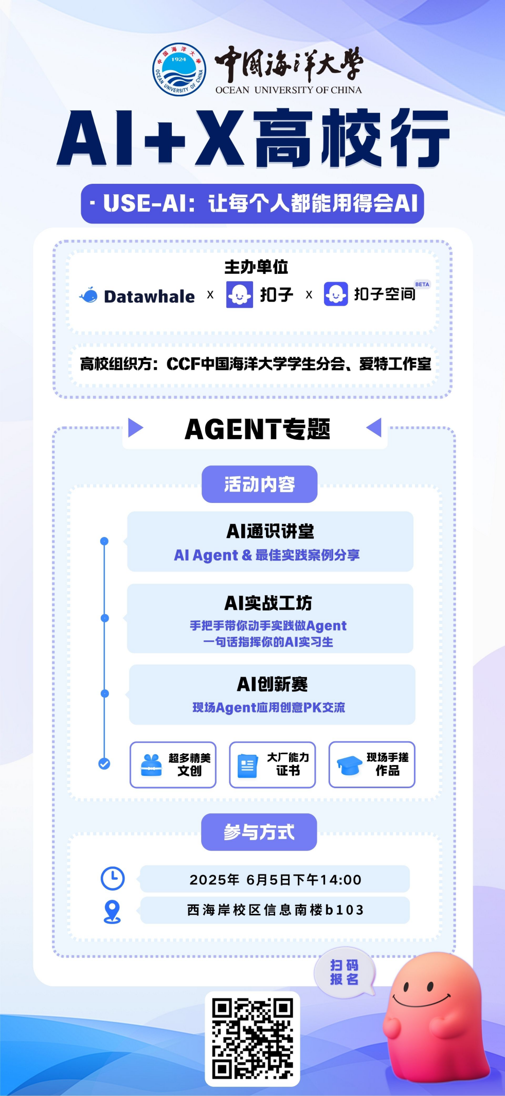 在人工智能飞速发展的今天,AI Agent正在成为推动行业变革的关键力量。为了助力同学们提升AI技术能力,紧跟前沿技术趋势,CCF笔趣阁 学生分会、爱特工作室携手Datawhale开源学习社区,将于2025年6月5日下午14:00在西海岸校区信息南楼b103启动“AI+X高校行Agent专题”活动。一场知识与实践的盛宴,一次创新思维的碰撞,一次探索AI无限可能的奇妙之旅,等你来赴约!