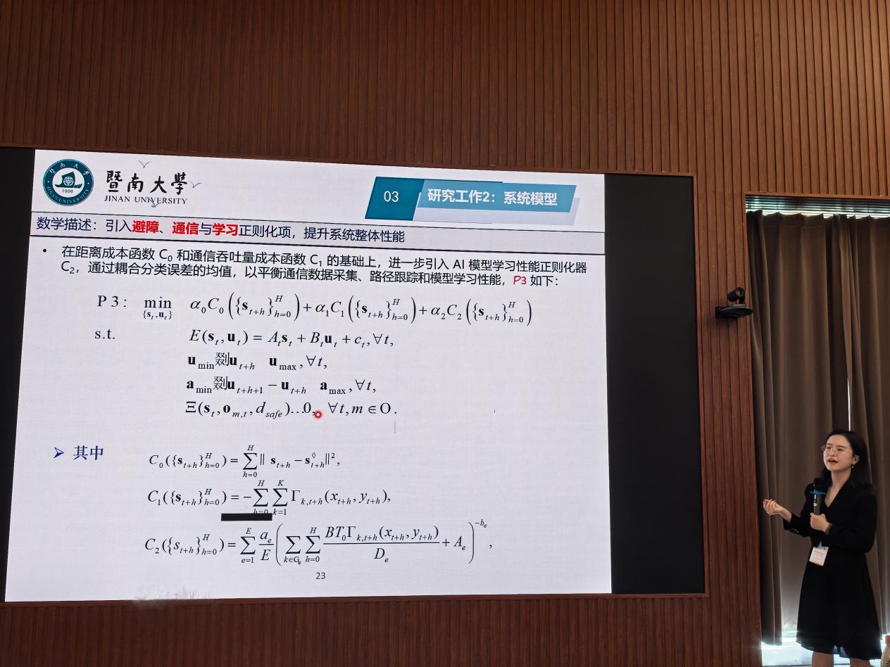 陈颖玚副教授针对自动驾驶场景的超可靠低时延通信要求,介绍了一种新颖的通信框架,该框架结合了速率分割多址接入和有限块长度设计,通过开发闭式解,联合优化了功率分配和速率分割,显著提高了系统可靠性,公平性和鲁棒性,有效支持了自动驾驶系统的关键通信需求。提问环节中,陈颖与在座同学讨论了方案中具体的参数调整以及该方案与其他网络模型之间的区别,为同学们的学习和研究提供了宝贵的参考。