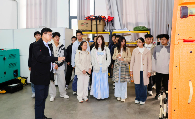 随后,董军宇带领大家来到团队的视觉系统与机器人实验室。“这里就像一个科技宝藏集结地。”面对实验室里令人目不暇接的仪器设备,石韵灵同学感叹道。董军宇向同学们逐一介绍了课题组开发的水下装备,包括水下手持成像设备、三维成像模组、水下遥控机器人ROV、水下1500米三维成像模组等,讲解了它们的设计理念和应用场景。接着,引导大家观摩实验室里正在进行的浊水相机验证实验和船舶水尺读取实验。同学们积极提问,现场气氛热烈。