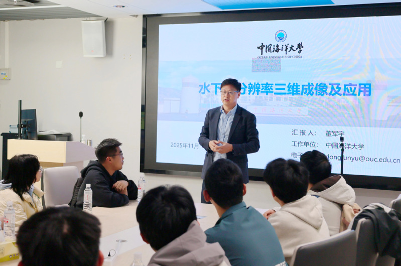 董军宇沿着水下三维成像技术研究的缘起娓娓道来,向同学们讲述了团队早期面临的重重挑战,以及他们是怎样一步步攻克难题,实现装备自主化,并最终将成果应用于智慧港口数字孪生。借助机器人水下作业的动态演示视频和三维重建图像,董军宇向大家展示了水下高精度三维重建的过程和细节。18双眼睛跟随水下机器人先是“潜入”青岛奥帆中心码头、青岛港董家口港区、青岛连心渔港海底进行勘察,接着又来到海南三亚观察珊瑚和砗磲的生长情况。“董老师演示时,灰蒙蒙的水下画面经人工智能算法处理,礁石的立体轮廓和贝类纹路都清晰显现,特别神奇。”欧宇航同学兴奋地表示,第一次跟随机器人“潜海”的体验,让他对人工智能专业产生了更大兴趣。
