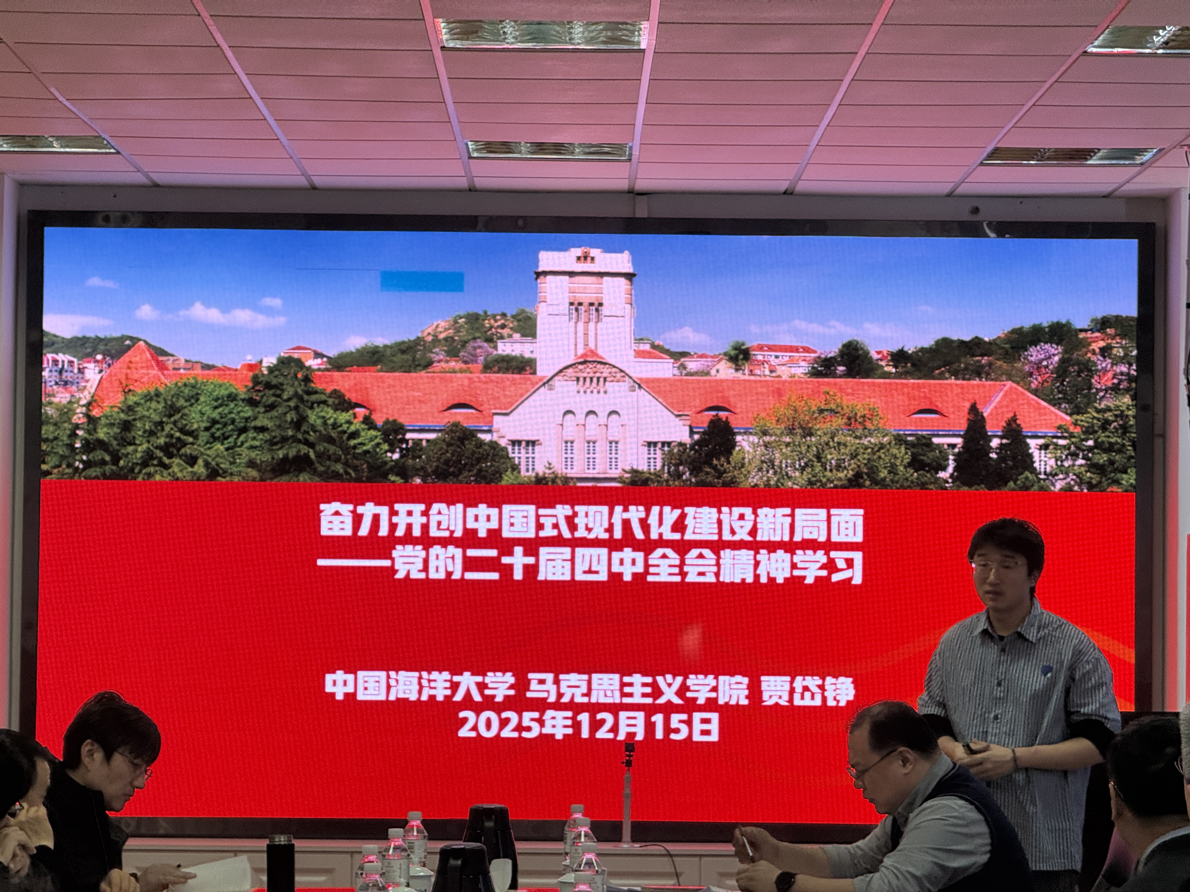贾岱铮以“奋力开创中国式现代化建设新局面”为题,围绕党的二十届四中全会召开的重大意义、核心内涵及“十五五”时期国家发展的战略部署,结合高等教育使命与海洋强国建设,进行了系统深入的解读。