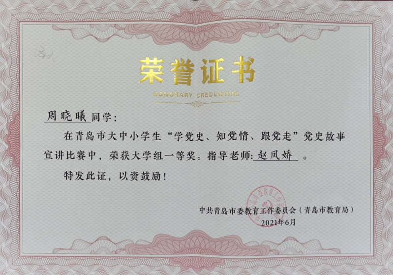 In the early stage, according to the requirements of the theme education practice program of learning the party history, knowing the party situation and following the party of the Education Working Committee of Qingdao municipal Party committee, the school organized students to actively participate in the party history story telling competition of learning the party history, knowing the party situation and following the party of primary and secondary school students in Qingdao. Selected by the college, recommended by the school, and selected by experts organized by the Municipal Education Working Committee, a total of 16 students in Qingdao won the first, second and third prizes of the university group respectively. The award-winning work Communist Party member Luo Ronghuan tells the story of Luo Ronghuan, an alumnus of our school, a great militarist of our country, and marshal of the Republic. It vividly shows the noble quality of the Communist Party member Luo Ronghuan, who is strict with himself and upright all his life, and has been unanimously affirmed by experts.