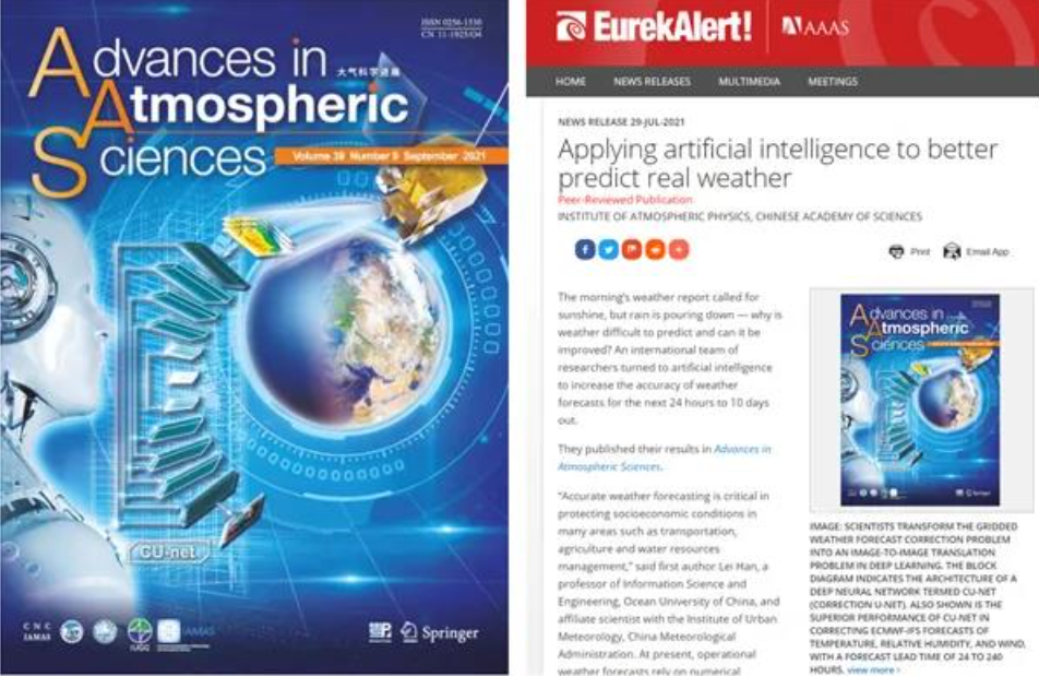 The team proposed a nested encoder-decoder network method to achieve intelligent deviation correction for numerical weather forecasts. The test results showed that this method achieved the highest improvement in forecast performance of more than 25% compared to ECMWF, which is commonly used in the industry, for difficult issues such as correcting 10-meter wind speed and wind direction. This research achievement was published in Advances in Atmospheric Sciences (AAS) as a cover paper and has been tracked by internationally renowned science and technology news platforms such as EurekAlert! (International media such as New York Times, CNN, BBC, etc. obtain scientific and technological news from this platform). This achievement has been applied to the key research and development program "Key Technologies for Prediction and Guarantee of the Beijing Winter Olympics" and its operational application has been launched in the Beijing Urban Meteorological Research Institute, and will be applied to the meteorological guarantee service for the 2022 Beijing Winter Olympics.