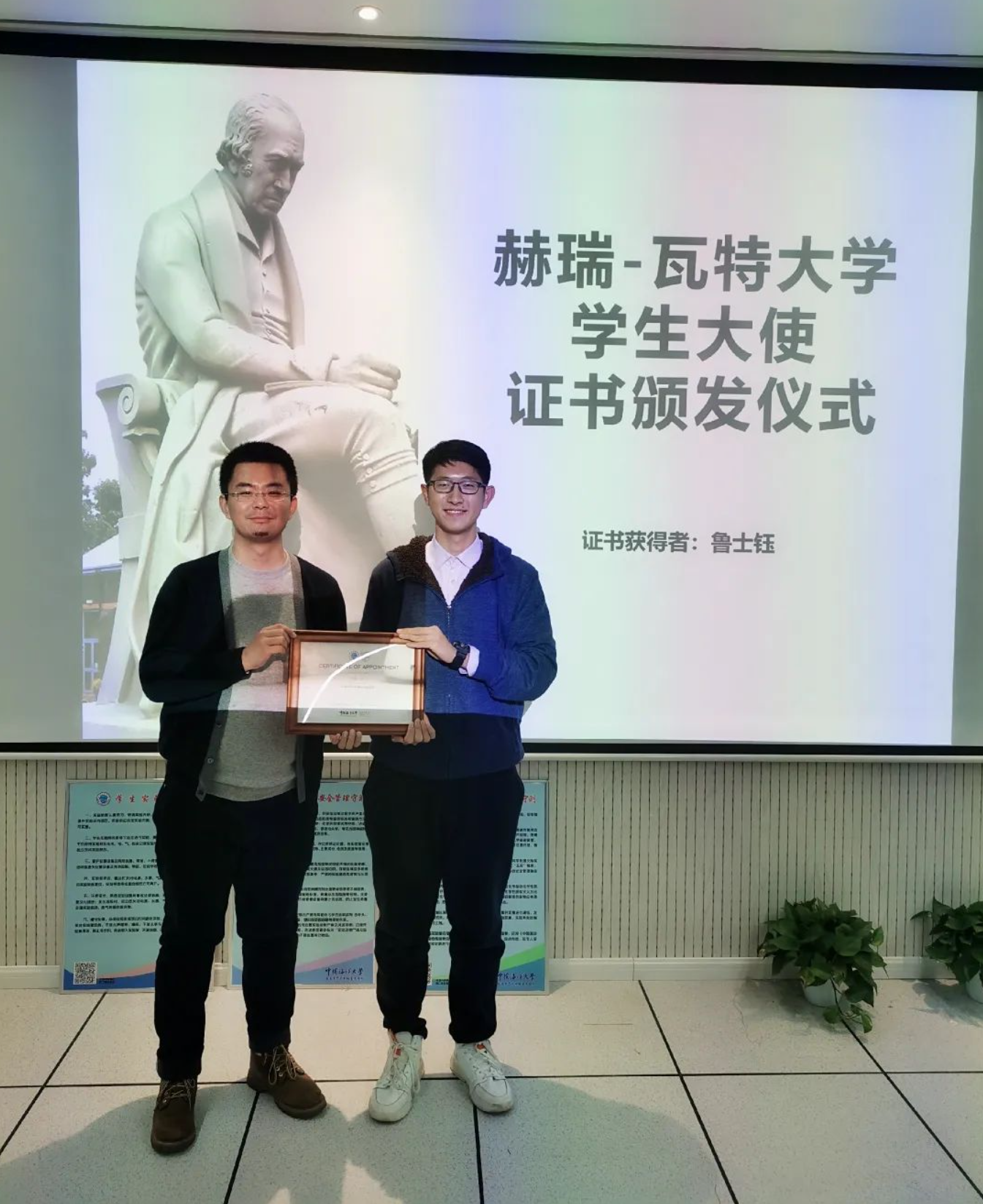 Based on the results of the previous knowledge competition and the comprehensive evaluation by the college leadership, Lu Shi Yu was chosen to be the Haida-Heriot-Watt student ambassador for this academic year with a one-year term. Lu Shi Yu had achieved excellent results in the previous knowledge competition and was very active in his daily studies and life, always willing to help others. His classmates liked him very much, and he also had a special talent – playing the clarinet at a professional level. Lu Shi Yu was very excited to receive the certificate, and he said, "Thank you so much to the college and everyone for awarding me this certificate. I will do my best to serve the project and everyone else! Thank you!"