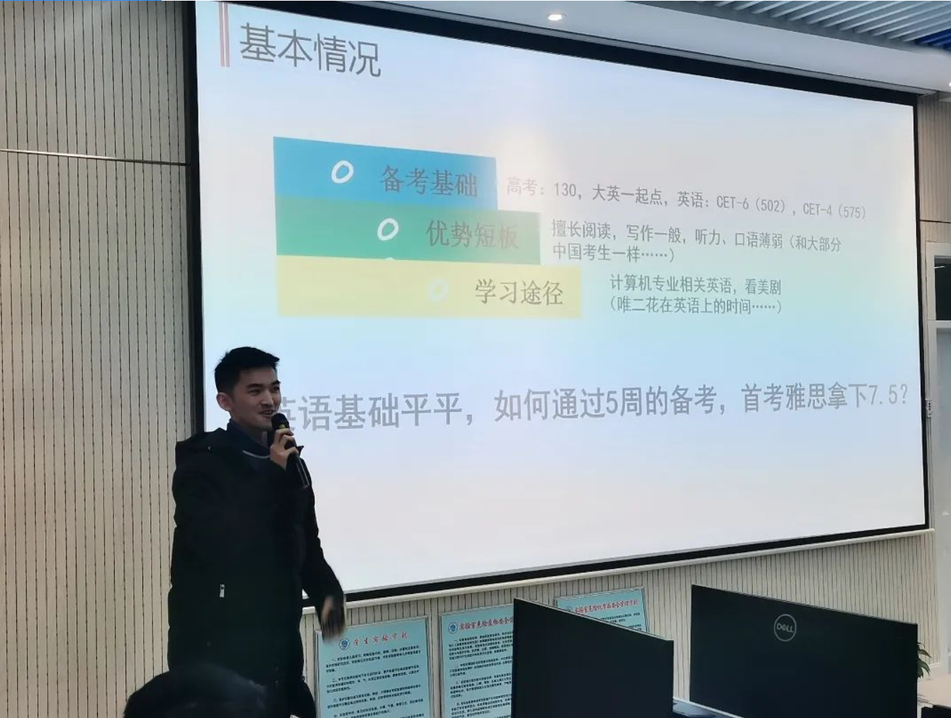 The final speaker who shared their IELTS exam experience was Fu Yanjie, a senior student majoring in confidentiality management. Yanjie has been admitted to Tianjin University through the recommendation system for postgraduate studies. Although he only took the IELTS exam once, he achieved an impressive score of 7.5 (Listening 7.5, Speaking 6.0, Reading 9.0, Writing 6.5). Unlike Peng's two-year "long-haul," Yanjie's strategy was to win quickly. So how did he achieve a score of 7.5 with only five weeks of preparation despite his average English foundation? The answer is simple: find a study method that suits you.
