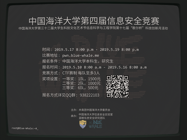 四届信息安全竞赛即将开启,大赛由共青团笔趣阁 委员会主办,承办为信息科学与工程学院Blue-Whale信息安全研究团队。本次大赛采用网上报名,线上比赛的形式,具体情况如下: