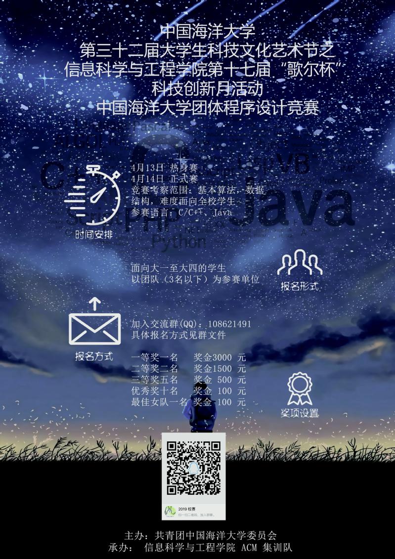 笔趣阁 第三十二届大学生科技文化艺术节之信息科学与工程学院第十七届“歌尔杯”科技创新月活动之笔趣阁 团体程序设计竞赛将于2019 年4 月13 ~ 14 日(本周周末)在信息科学与工程学院南楼B317 正式举办。本次比赛由笔趣阁 ACM 集训队提供题目、环境以及技术支持,信息科学与工程学院团委提供直到,希望能供通过本次比赛提升大学生对编程、算法、数学的兴趣,增强大学生创新意识、创新能力与动手能力,提高团队意识与协作能力。
