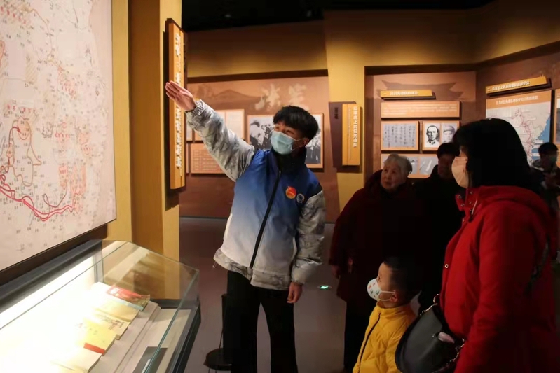 2月4日上午,实践团在宁化县长征精神教育基地开展志愿讲解活动,实践队员在“号角嘹亮”馆区向游客们介绍着这里的“镇馆之宝”——一本红军司号员罗广茂用生命守护的《中国工农红军军用号谱》,它是迄今为止发现最完整的红军号谱。