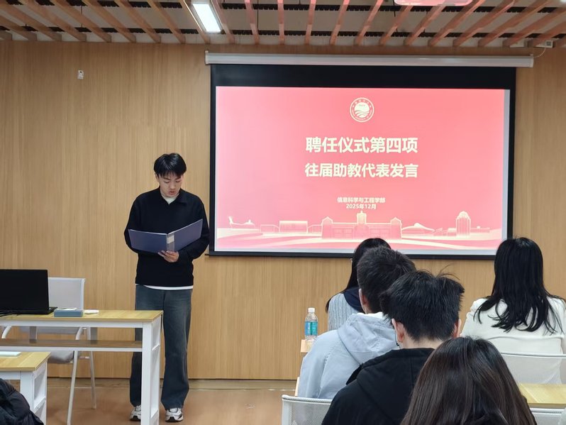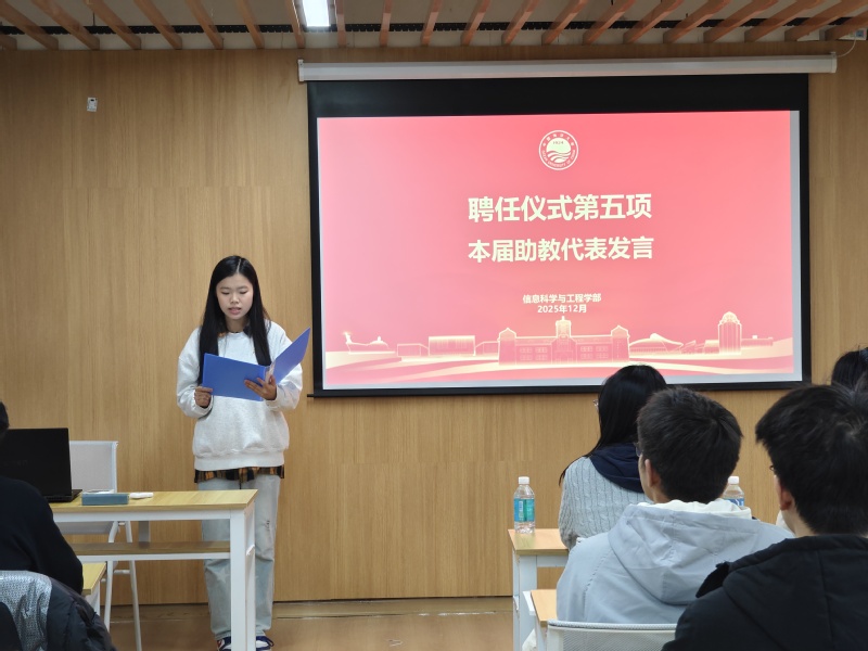 最后,本届助教代表庄环嘉同学代表全体新聘助教作出承诺:恪尽职守,精准传递信息、促进师生沟通;聚焦辅学,注重启发引导、助力深化理解;珍视历练,在服务中实现共同进步。期待全体新助教秉持初心,为学部优良学风贡献青春力量。